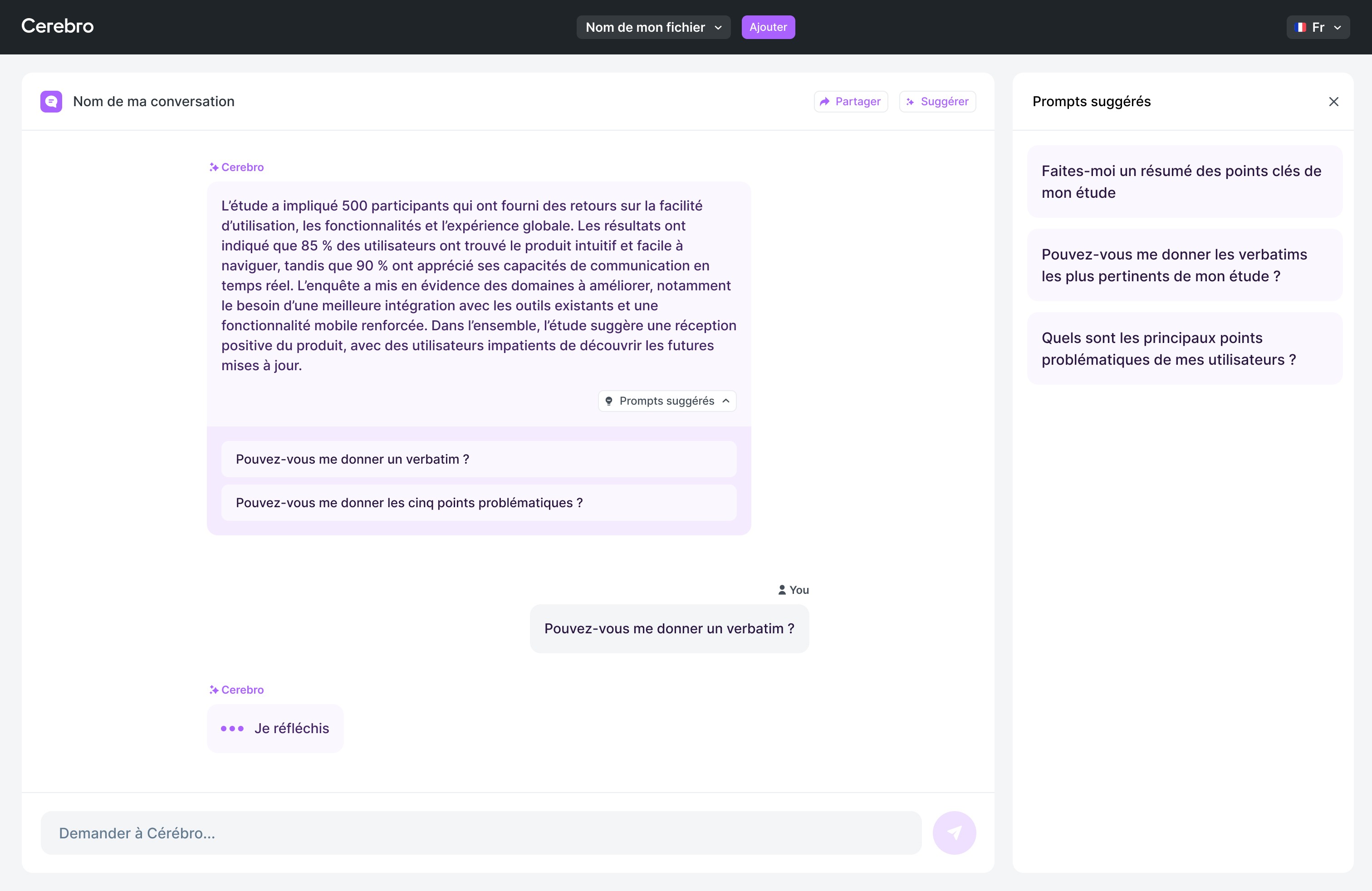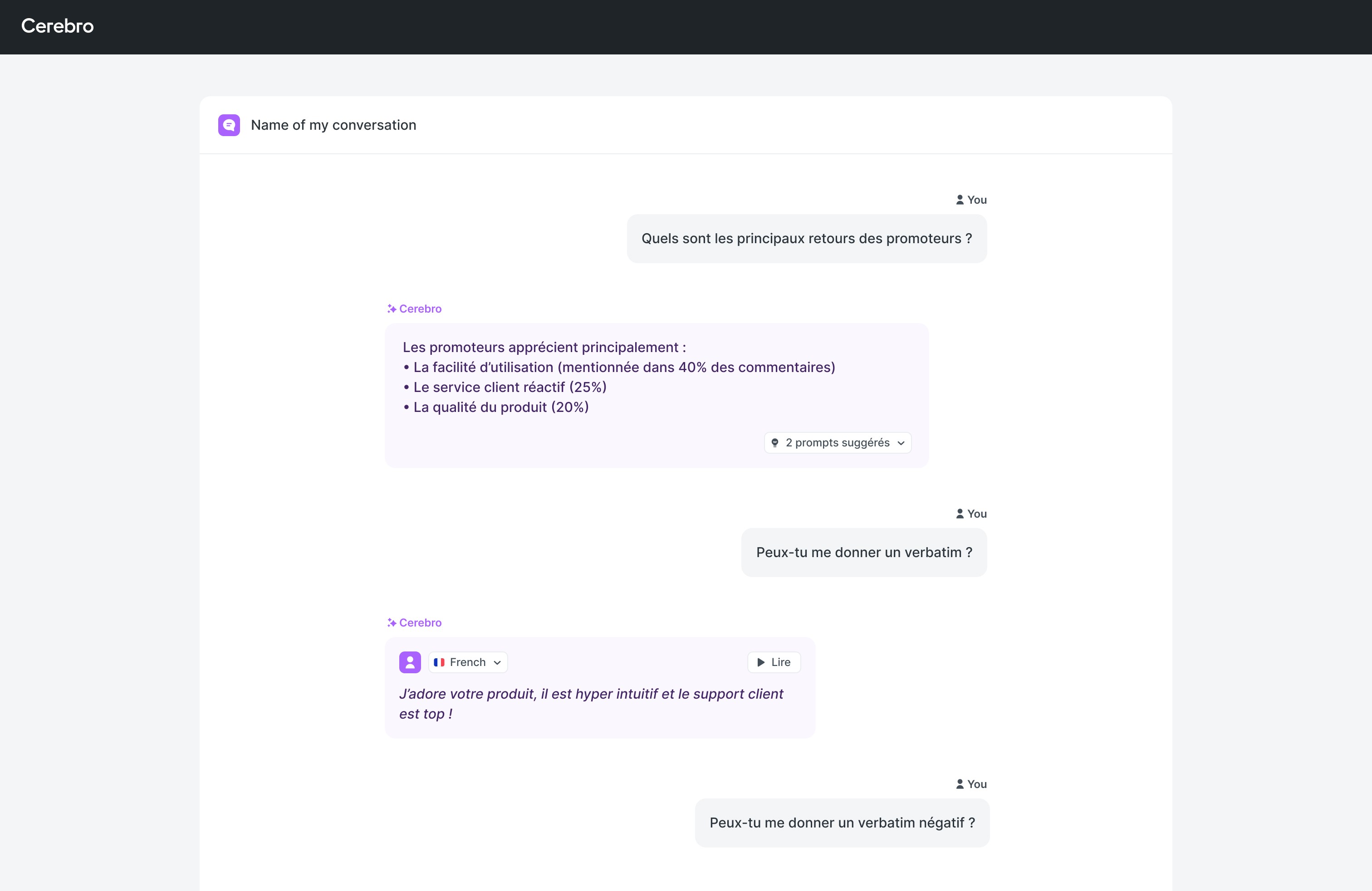 Affinez vos questions grâce à l'IA pour les rendre plus claires et plus percutantes. Qu'il s'agisse d'un retour d'information sur une fonctionnalité ou de la satisfaction d'un utilisateur, Cerebro vous aide à poser les questions de façon plus précise.