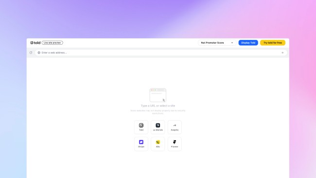 Live Site Preview is a new tool that lets you load your own website URL and instantly see any Told survey type rendered directly on top of it. How it works: Enter your site URL in the preview tool, select the survey type you want to test (NPS, modal, product tour, etc.), and get an instant visual of how it will look on your actual site — no installation, no code, no guesswork. Why it matters: The biggest friction in adopting a new survey tool is uncertainty. Will it look right on my site? Will it feel native? Live Site Preview removes that doubt entirely by letting you see the real thing before committing to a single line of code.